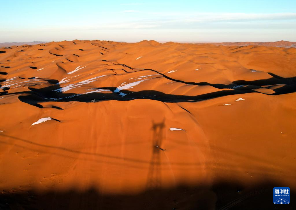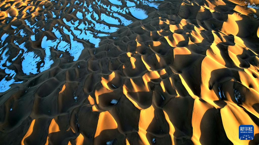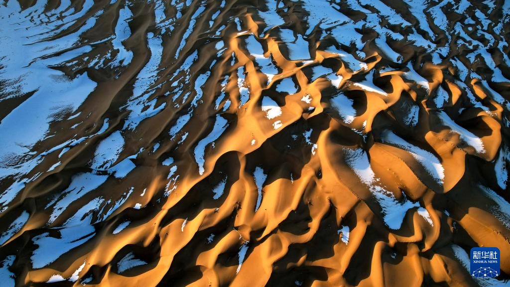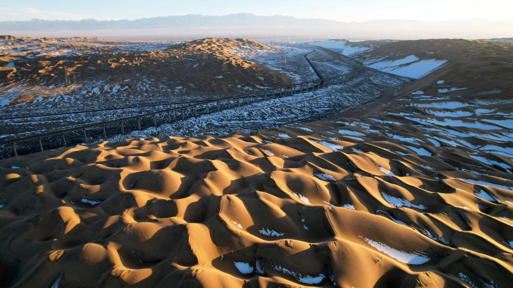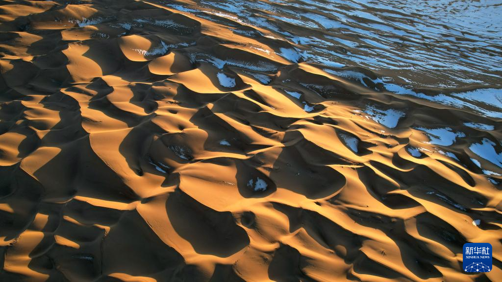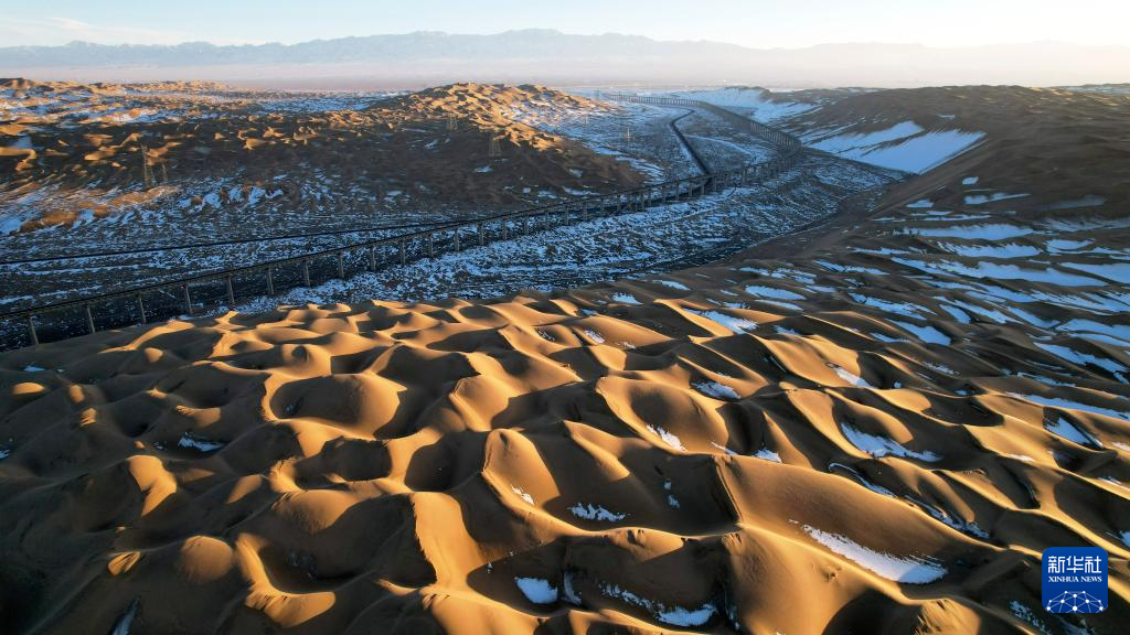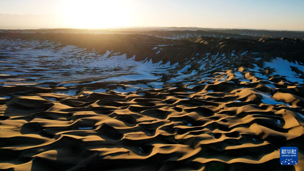 一场降雪过后,甘肃省酒泉市阿克塞哈萨克族自治县境内的库木塔格沙漠连绵起伏的沙丘在落日余晖下泛出层层金色光芒,夕阳与白雪映衬下的沙漠呈现冬日壮美画卷。