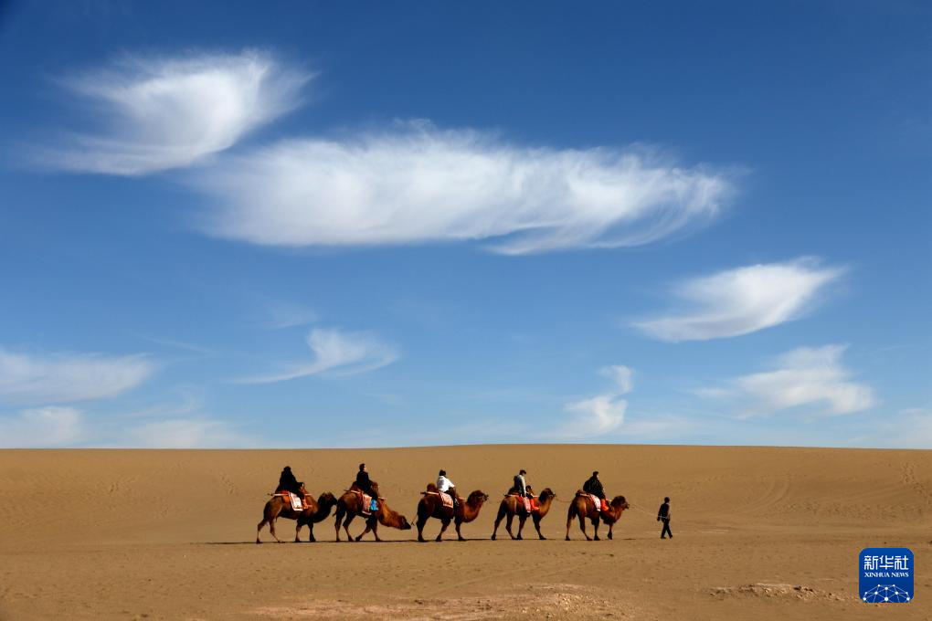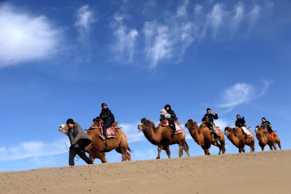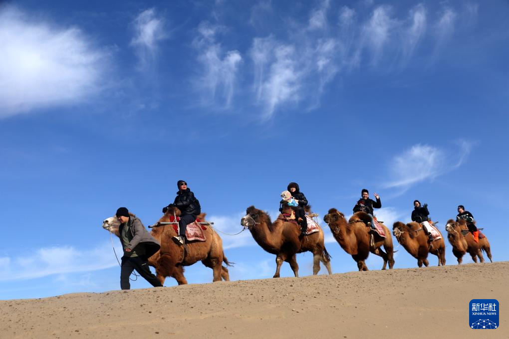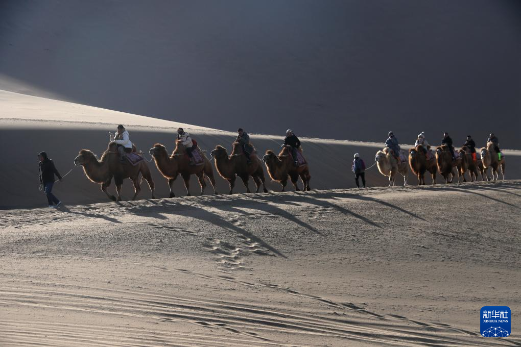 12月1日,游客在甘肃省敦煌市鸣沙山月牙泉景区骑骆驼游览。新华社发(张晓亮 摄)