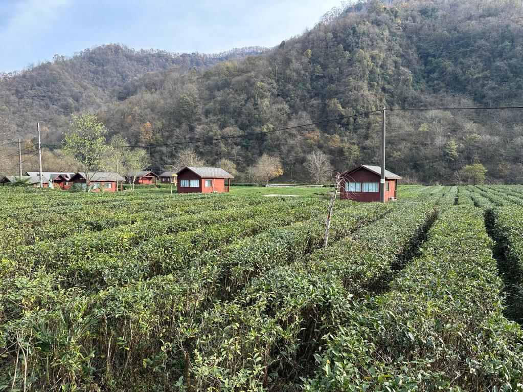 马家山村以东的康县阳坝镇同样因为茶旅融合发展吸引着全国各地的游客。阳坝镇油房坝村位于梅园沟景区天鹅湖畔。这里依山傍水,村庄道路整洁干净。即使初冬的寒风已悄然而至,但郁郁葱葱的茶树依然挺立于田间地头,充满了蓬勃生机。